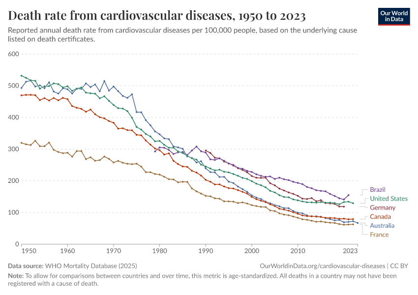 Saloni Dattani (2025) - “Death rates from cardiovascular disease have fallen dramatically — what were the breakthroughs behind this?” Published online at OurWorldinData.org. Retrieved from: 'https://refactor-responseset-ergonom.owid.pages.dev:8789/20260119-084543/cardiovascular-deaths-decline.html' [Online Resource] (archived on January 19, 2026).BibTeX citation