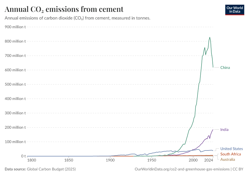 This interactive chart shows annual emissions from cement production by country, over time.