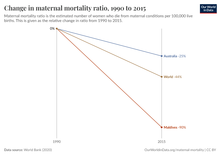 The countries that achieved the largest decline are found at the bottom of the chart. Globally, the Maldives achieved the greatest reduction: the maternal mortality ratio declined by 90% from 677 to 68 deaths per 100,000 live births — a very impressive achievement.