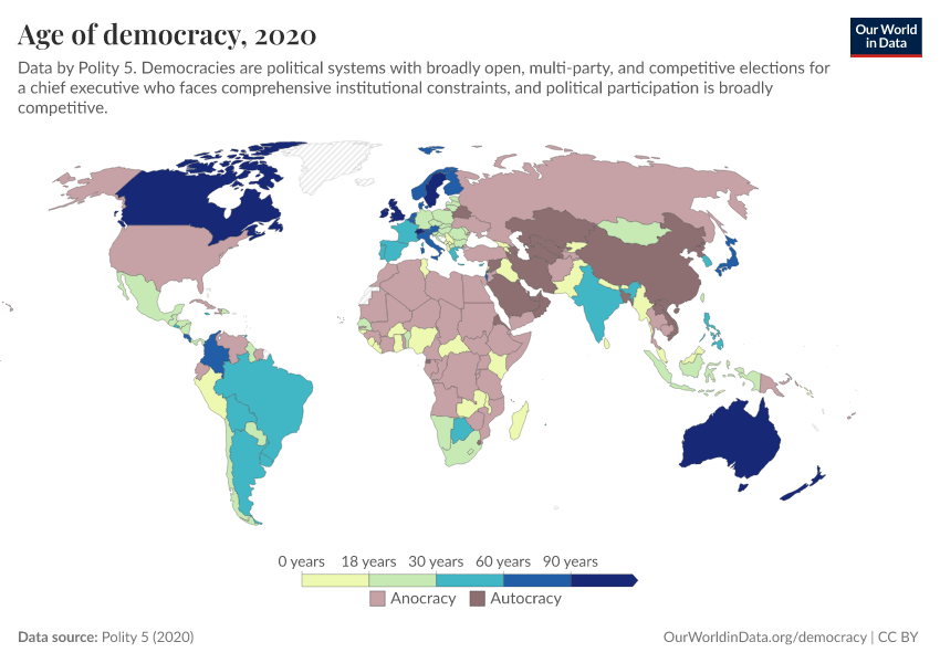 “Data Page: Age of democracy”, part of the following publication: Bastian Herre, Lucas Rodés-Guirao, and Esteban Ortiz-Ospina (2013) - “Democracy”. Data adapted from Polity 5. Retrieved from https://refactor-responseset-ergonom.owid.pages.dev:8789/20260223-071105/grapher/age-of-democracy-polity.html [online resource] (archived on February 23, 2026).How to cite this data