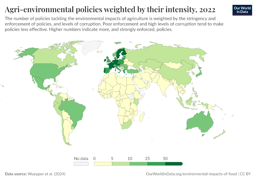 “Data Page: Agri-environmental policies weighted by their intensity”. Our World in Data (2026). Data adapted from Wuepper et al. (2024). Retrieved from https://refactor-responseset-ergonom.owid.pages.dev:8789/20250909-093708/grapher/agri-environmental-policies-intensity.html [online resource] (archived on September 9, 2025).How to cite this data