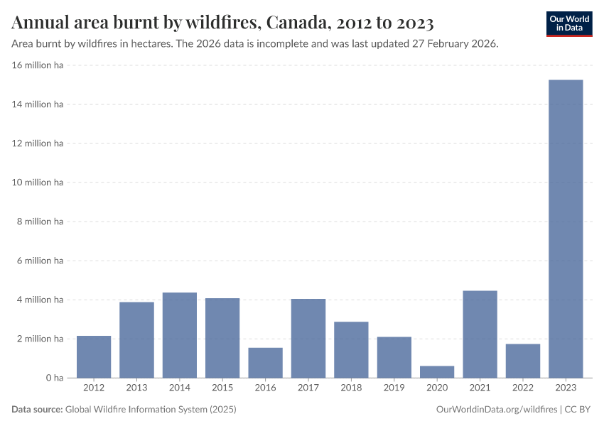 Global Wildfire Information System (2026); Global Wildfire Information System (2024) – with minor processing by Our World in Data. “Annual area burnt by wildfires” [dataset]. Global Wildfire Information System, “Seasonal wildfire trends” [original data]. Retrieved February 26, 2026 from https://refactor-responseset-ergonom.owid.pages.dev:8789/20260220-091140/grapher/annual-area-burnt-by-wildfires.html (archived on February 20, 2026).