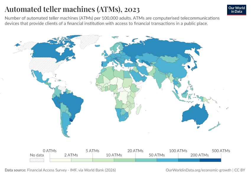 “Data Page: Automated teller machines (ATMs)”. Our World in Data (2026). Data adapted from Financial Access Survey - IMF, via World Bank. Retrieved from https://refactor-responseset-ergonom.owid.pages.dev:8789/20260202-181317/grapher/automated-teller-machines-atms-per-100000-adults.html [online resource] (archived on February 2, 2026).How to cite this data
