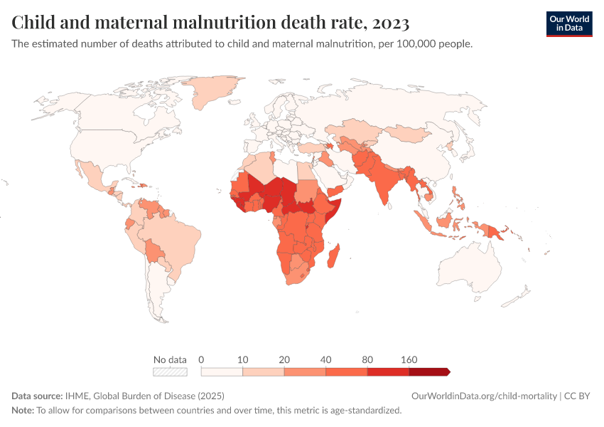 IHME, Global Burden of Disease (2025) – with major processing by Our World in Data. “Child and maternal malnutrition death rate” [dataset]. IHME, Global Burden of Disease, “Global Burden of Disease - Risk Factors - Deaths” [original data]. Retrieved February 26, 2026 from https://refactor-responseset-ergonom.owid.pages.dev:8789/20260213-112438/grapher/child-and-maternal-malnutrition-death-rate.html (archived on February 13, 2026).