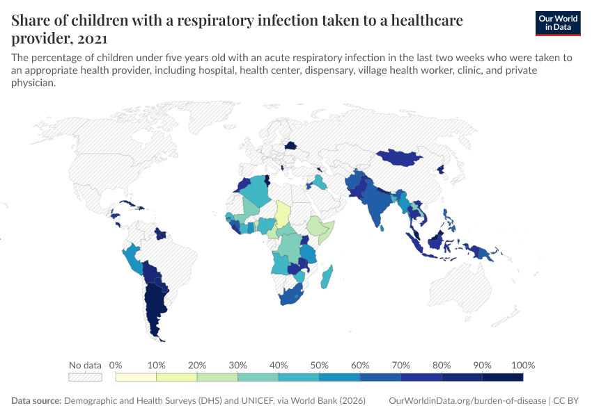 Demographic and Health Surveys (DHS) and UNICEF, via World Bank (2026) – processed by Our World in Data. “Share of children with a respiratory infection taken to a healthcare provider ” [dataset]. Demographic and Health Surveys (DHS) and UNICEF, via World Bank, “World Development Indicators 125” [original data]. Retrieved February 26, 2026 from https://refactor-responseset-ergonom.owid.pages.dev:8789/20260202-181317/grapher/children-treated-ari.html (archived on February 2, 2026).