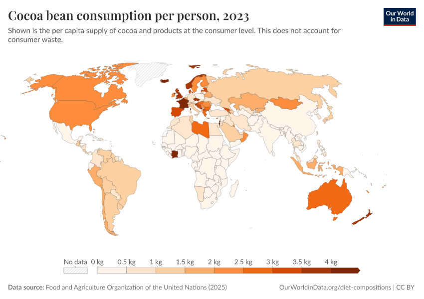 “Data Page: Yearly per capita supply of cocoa beans”. Our World in Data (2026). Data adapted from Food and Agriculture Organization of the United Nations. Retrieved from https://refactor-responseset-ergonom.owid.pages.dev:8789/20260225-014904/grapher/chocolate-consumption-per-person.html [online resource] (archived on February 25, 2026).How to cite this data