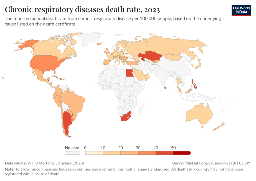 “Data Page: Chronic respiratory diseases death rate”, part of the following publication: Saloni Dattani, Fiona Spooner, Hannah Ritchie, and Max Roser (2023) - “Causes of Death”. Data adapted from WHO Mortality Database. Retrieved from https://refactor-responseset-ergonom.owid.pages.dev:8789/20250909-093708/grapher/chronic-respiratory-diseases-death-rate-who-mdb.html [online resource] (archived on September 9, 2025).How to cite this data