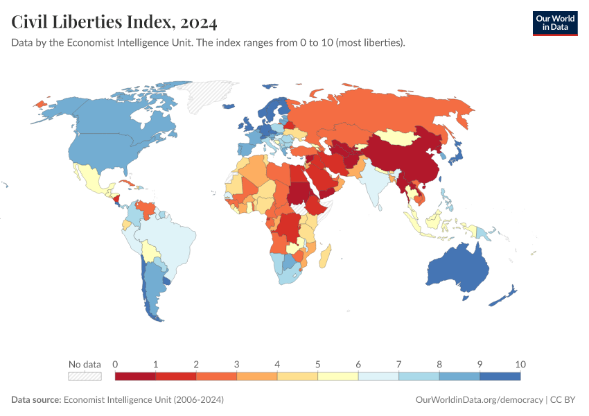 Economist Intelligence Unit (2006-2024) – processed by Our World in Data. “Civil Liberties Index” [dataset]. Economist Intelligence Unit, “Democracy Index 2021: The China challenge”; Economist Intelligence Unit, “Democracy Index 2022: Frontline democracy and the battle for Ukraine”; Economist Intelligence Unit, “Democracy Index 2023: Age of Conflict”; Economist Intelligence Unit, “Democracy Index 2024: What's wrong with representative democracy?”; Gapminder, “Democracy Index v4”; Various sources, “Population” [original data]. Retrieved February 26, 2026 from https://refactor-responseset-ergonom.owid.pages.dev:8789/20260119-070102/grapher/civil-liberties-index-eiu.html (archived on January 19, 2026).