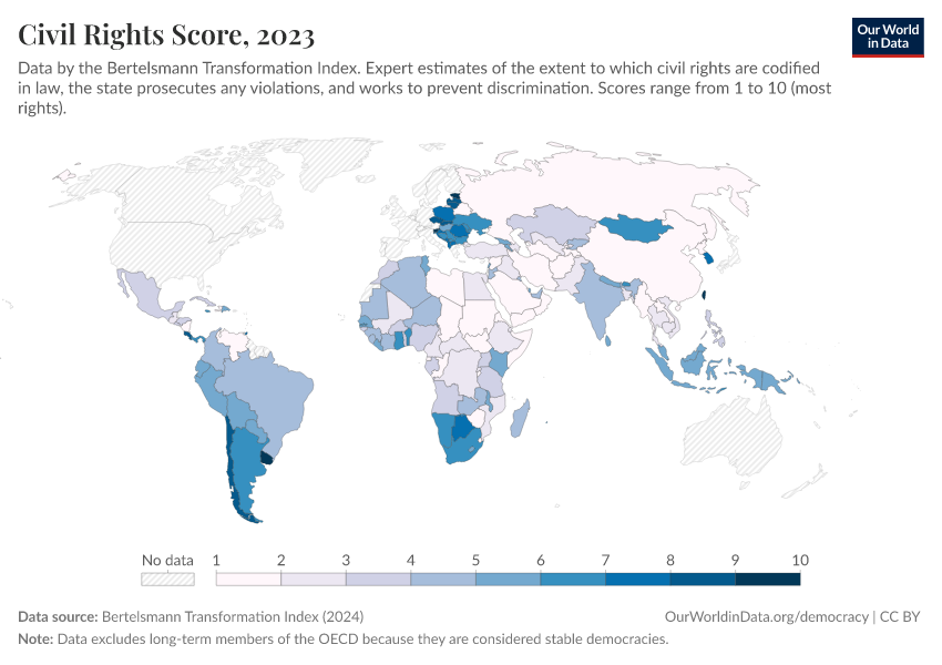 Bertelsmann Transformation Index (2024) – processed by Our World in Data. “Civil Rights Score” [dataset]. Bertelsmann Transformation Index, “Bertelsmann Transformation Index, Scores” [original data]. Retrieved February 26, 2026 from https://refactor-responseset-ergonom.owid.pages.dev:8789/20260204-165456/grapher/civil-rights-score-bti.html (archived on February 4, 2026).
