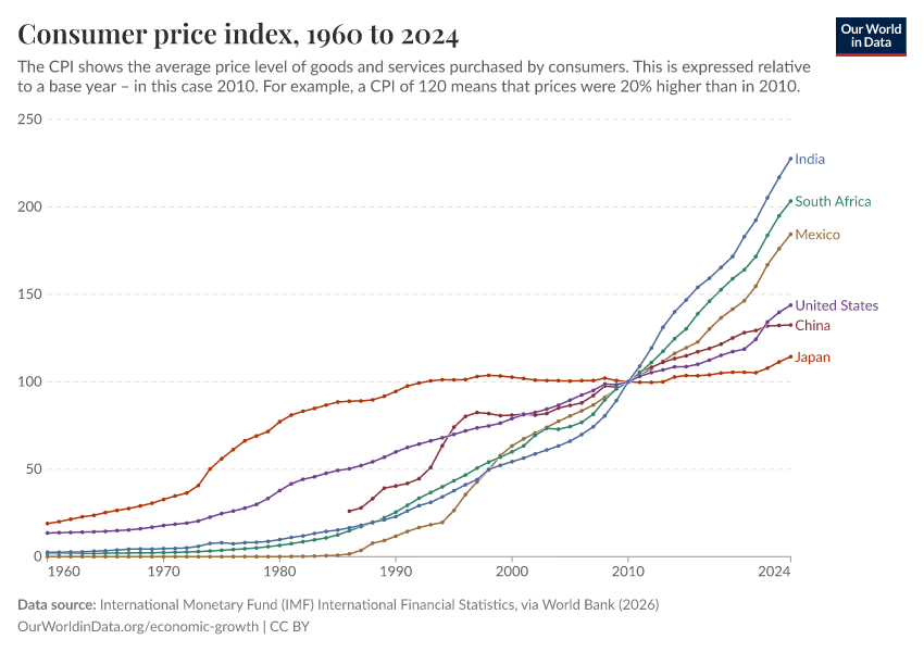International Monetary Fund (IMF) International Financial Statistics, via World Bank (2026) – processed by Our World in Data. “Consumer price index” [dataset]. International Monetary Fund (IMF) International Financial Statistics, via World Bank, “World Development Indicators 125” [original data]. Retrieved February 26, 2026 from https://refactor-responseset-ergonom.owid.pages.dev:8789/20260202-181317/grapher/consumer-price-index.html (archived on February 2, 2026).