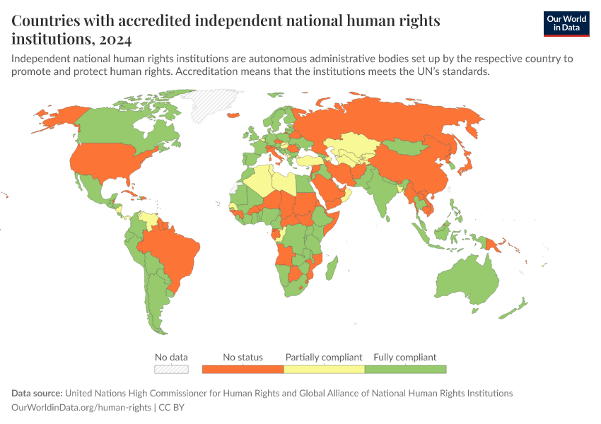 “Data Page: Countries with accredited independent national human rights institutions”. Our World in Data (2026). Data adapted from United Nations High Commissioner for Human Rights and Global Alliance of National Human Rights Institutions. Retrieved from https://refactor-responseset-ergonom.owid.pages.dev:8789/20251120-211038/grapher/countries-with-independent-national-human-rights-institution.html [online resource] (archived on November 20, 2025).How to cite this data