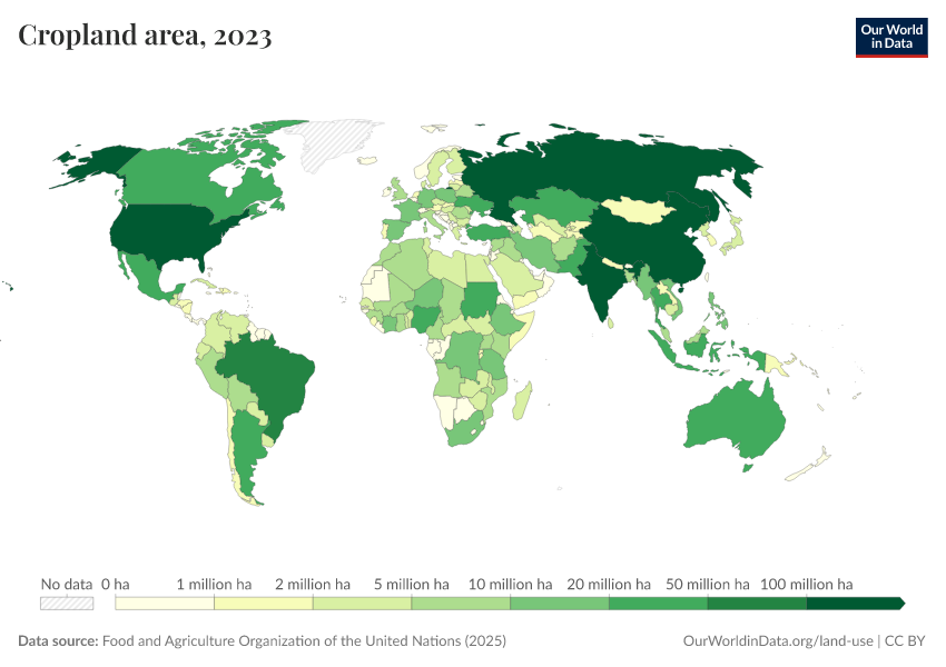 “Data Page: Cropland area”, part of the following publication: Hannah Ritchie, Pablo Rosado, and Max Roser (2023) - “Agricultural Production”. Data adapted from Food and Agriculture Organization of the United Nations. Retrieved from https://refactor-responseset-ergonom.owid.pages.dev:8789/20260119-235736/grapher/cropland-area.html [online resource] (archived on January 19, 2026).How to cite this data