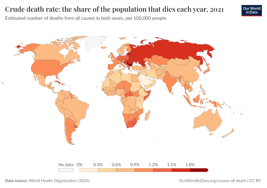 World Health Organization (2024) – with major processing by Our World in Data. “Crude death rate: the share of the population that dies each year” [dataset]. World Health Organization, “Global Health Estimates” [original data]. Retrieved February 26, 2026 from https://refactor-responseset-ergonom.owid.pages.dev:8789/20250909-093708/grapher/crude-death-rate-the-share-of-the-population-that-dies-each-year-who.html (archived on September 9, 2025).