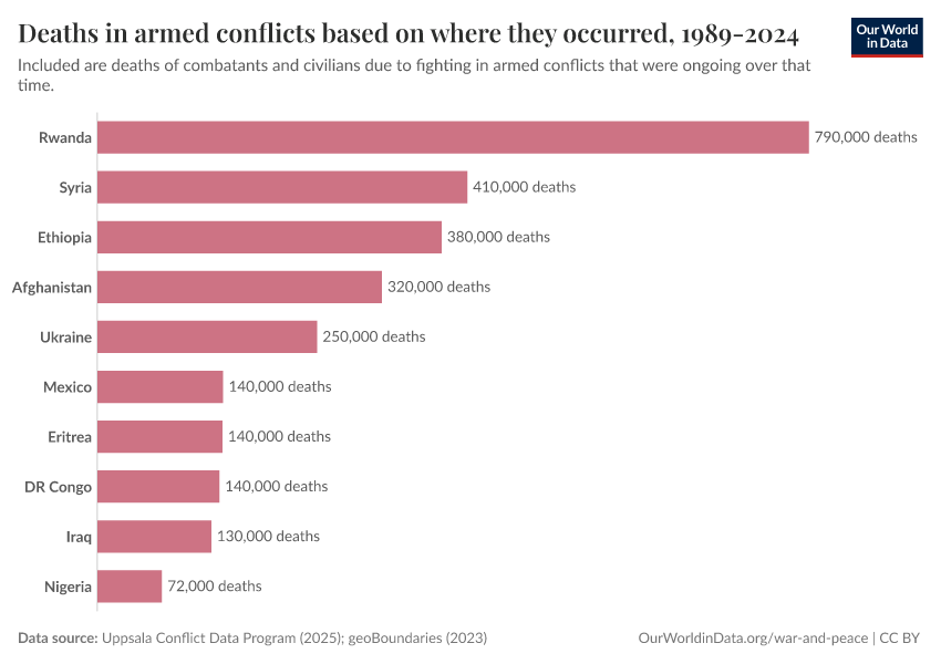 Uppsala Conflict Data Program (2023); Natural Earth (2022) – processed by Our World in Data. “Deaths in armed conflicts based on where they occurred, 1989-2024” [dataset]. Uppsala Conflict Data Program, “Georeferenced Event Dataset (cumulative)”; Natural Earth, “Large scale data (1:10m Cultural Vectors), Admin 0 Countries 5.1.1” [original data]. Retrieved February 26, 2026 from https://refactor-responseset-ergonom.owid.pages.dev:8789/20250909-093708/grapher/cumulative-deaths-in-armed-conflicts.html (archived on September 9, 2025).