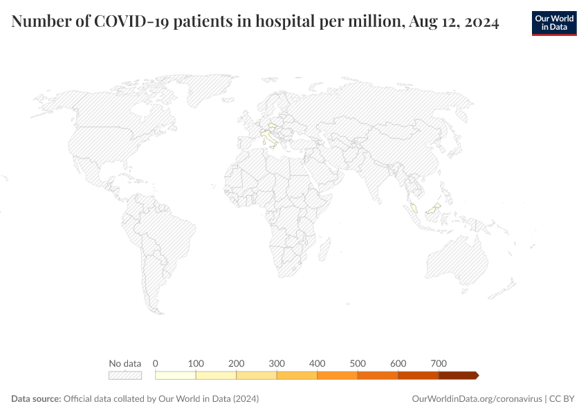 “Data Page: Number of COVID-19 patients in hospital per million”, part of the following publication: Edouard Mathieu, Hannah Ritchie, Lucas Rodés-Guirao, Cameron Appel, Daniel Gavrilov, Charlie Giattino, Joe Hasell, Bobbie Macdonald, Saloni Dattani, Diana Beltekian, Esteban Ortiz-Ospina, and Max Roser (2020) - “COVID-19 Pandemic”. Data adapted from Official data collated by Our World in Data. Retrieved from https://refactor-responseset-ergonom.owid.pages.dev:8789/20250909-093708/grapher/current-covid-hospitalizations-per-million.html [online resource] (archived on September 9, 2025).