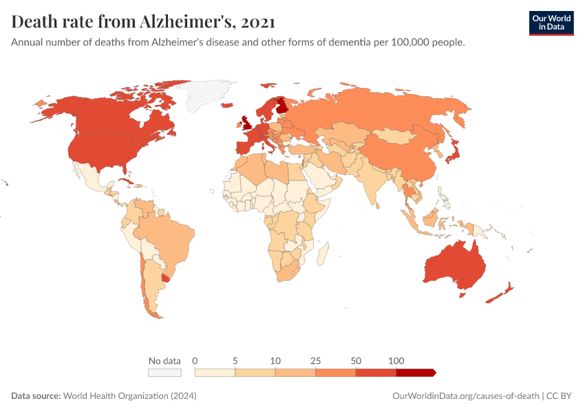 World Health Organization (2024) – with major processing by Our World in Data. “Death rate from Alzheimer's” [dataset]. World Health Organization, “Global Health Estimates” [original data]. Retrieved February 26, 2026 from https://refactor-responseset-ergonom.owid.pages.dev:8789/20250909-093708/grapher/death-rate-from-alzheimers-other-dementias-ghe.html (archived on September 9, 2025).