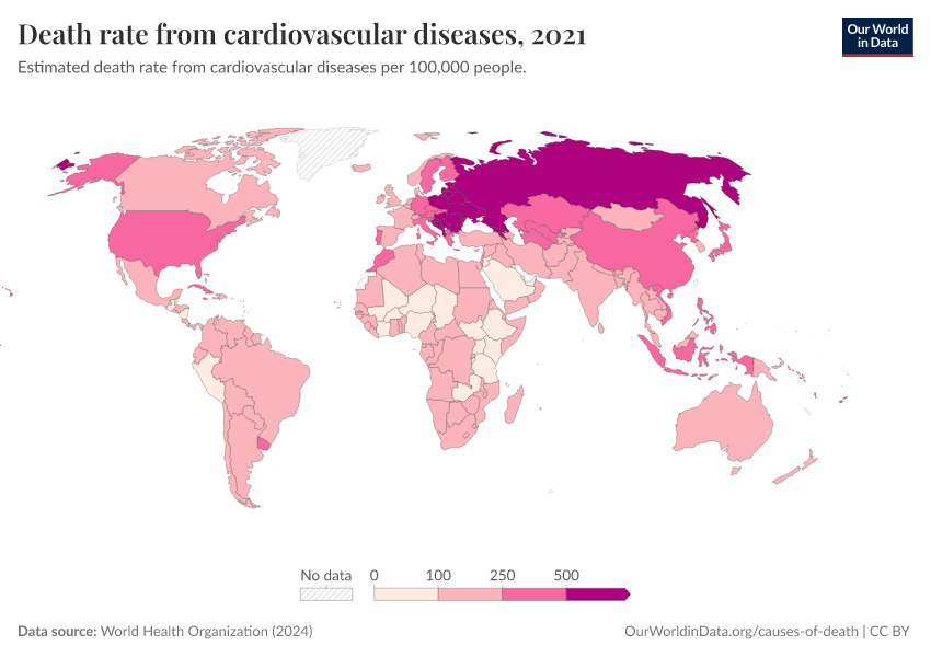 World Health Organization (2024) – with major processing by Our World in Data. “Death rate from cardiovascular diseases” [dataset]. World Health Organization, “Global Health Estimates” [original data]. Retrieved February 26, 2026 from https://refactor-responseset-ergonom.owid.pages.dev:8789/20250909-093708/grapher/death-rate-from-cardiovascular-disease-ghe.html (archived on September 9, 2025).