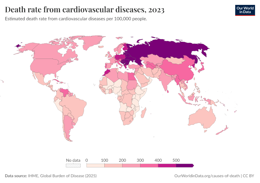 IHME, Global Burden of Disease (2025) – with major processing by Our World in Data. “Death rate from cardiovascular diseases” [dataset]. IHME, Global Burden of Disease, “Global Burden of Disease - Deaths” [original data]. Retrieved February 26, 2026 from https://refactor-responseset-ergonom.owid.pages.dev:8789/20260211-174736/grapher/death-rate-from-cardiovascular-diseases.html (archived on February 11, 2026).