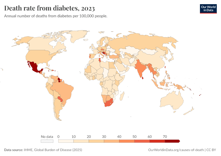 “Data Page: Death rate from diabetes”, part of the following publication: Esteban Ortiz-Ospina and Max Roser (2016) - “Global Health”. Data adapted from IHME, Global Burden of Disease. Retrieved from https://refactor-responseset-ergonom.owid.pages.dev:8789/20260211-174736/grapher/death-rate-from-diabetes-gbd.html [online resource] (archived on February 11, 2026).How to cite this data