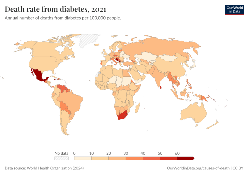 World Health Organization (2024) – with major processing by Our World in Data. “Death rate from diabetes” [dataset]. World Health Organization, “Global Health Estimates” [original data]. Retrieved February 26, 2026 from https://refactor-responseset-ergonom.owid.pages.dev:8789/20250909-093708/grapher/death-rate-from-diabetes-ghe.html (archived on September 9, 2025).