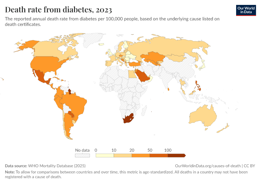 WHO Mortality Database (2025) – with minor processing by Our World in Data. “Death rate from diabetes” [dataset]. WHO Mortality Database, “WHO Mortality Database” [original data]. Retrieved February 26, 2026 from https://refactor-responseset-ergonom.owid.pages.dev:8789/20250909-093708/grapher/death-rate-from-diabetes-who-mdb.html (archived on September 9, 2025).