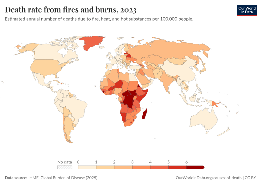 IHME, Global Burden of Disease (2025) – with major processing by Our World in Data. “Death rate from fires and burns” [dataset]. IHME, Global Burden of Disease, “Global Burden of Disease - Deaths” [original data]. Retrieved February 26, 2026 from https://refactor-responseset-ergonom.owid.pages.dev:8789/20260211-174736/grapher/death-rate-from-fires-and-burns-ihme.html (archived on February 11, 2026).