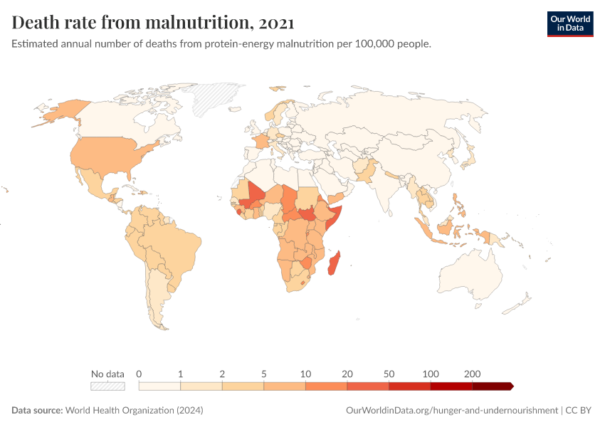 World Health Organization (2024) – with major processing by Our World in Data. “Death rate from malnutrition” [dataset]. World Health Organization, “Global Health Estimates” [original data]. Retrieved February 26, 2026 from https://refactor-responseset-ergonom.owid.pages.dev:8789/20250909-093708/grapher/death-rate-from-malnutrition-ghe.html (archived on September 9, 2025).