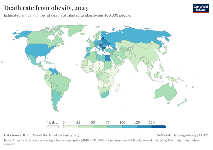 IHME, Global Burden of Disease (2025) – with major processing by Our World in Data. “Death rate from obesity” [dataset]. IHME, Global Burden of Disease, “Global Burden of Disease - Risk Factors - Deaths” [original data]. Retrieved February 26, 2026 from https://refactor-responseset-ergonom.owid.pages.dev:8789/20260213-112438/grapher/death-rate-from-obesity-gbd.html (archived on February 13, 2026).