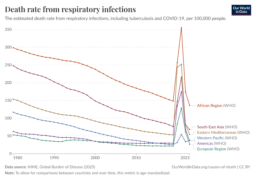 IHME, Global Burden of Disease (2025) – with major processing by Our World in Data. “Death rate from respiratory infections” [dataset]. IHME, Global Burden of Disease, “Global Burden of Disease - Deaths” [original data]. Retrieved February 26, 2026 from https://refactor-responseset-ergonom.owid.pages.dev:8789/20260211-174736/grapher/death-rate-from-respiratory-infections.html (archived on February 11, 2026).