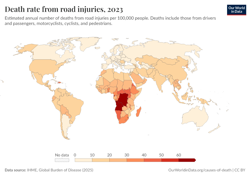 IHME, Global Burden of Disease (2025) – with major processing by Our World in Data. “Death rate from road injuries” [dataset]. IHME, Global Burden of Disease, “Global Burden of Disease - Deaths” [original data]. Retrieved February 26, 2026 from https://refactor-responseset-ergonom.owid.pages.dev:8789/20260211-174736/grapher/death-rate-from-road-accidents.html (archived on February 11, 2026).
