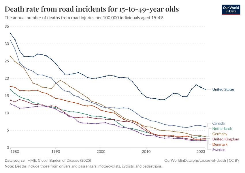 “Data Page: Death rate from road incidents for 15-to-49-year olds”, part of the following publication: Esteban Ortiz-Ospina and Max Roser (2016) - “Global Health”. Data adapted from IHME, Global Burden of Disease. Retrieved from https://refactor-responseset-ergonom.owid.pages.dev:8789/20260211-174736/grapher/death-rate-from-road-accidents-for-15--to-49-year-olds.html [online resource] (archived on February 11, 2026).How to cite this data