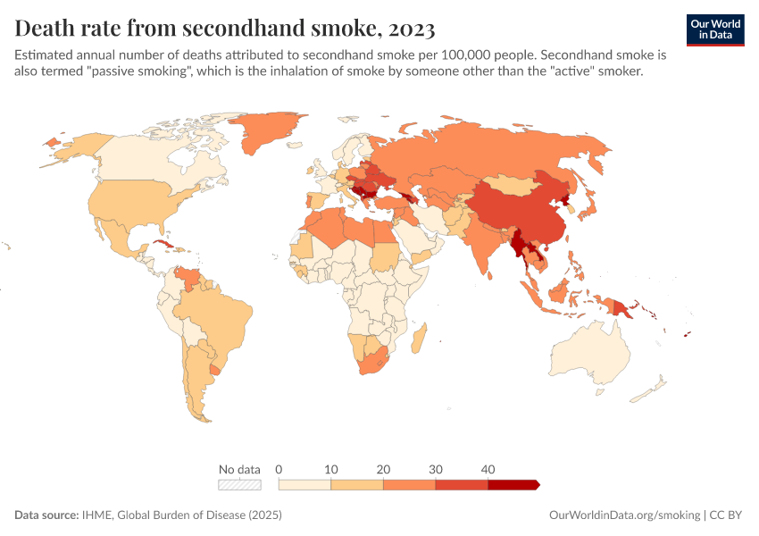 IHME, Global Burden of Disease (2025) – with major processing by Our World in Data. “Death rate from secondhand smoke” [dataset]. IHME, Global Burden of Disease, “Global Burden of Disease - Risk Factors - Deaths” [original data]. Retrieved February 26, 2026 from https://refactor-responseset-ergonom.owid.pages.dev:8789/20260213-113303/grapher/death-rate-from-secondhand-smoke-gbd.html (archived on February 13, 2026).