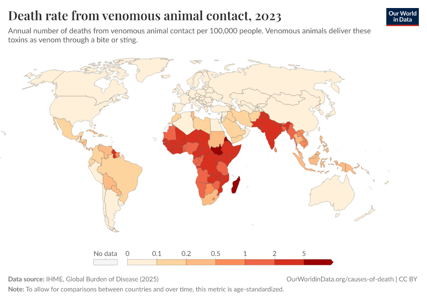 IHME, Global Burden of Disease (2025) – with major processing by Our World in Data. “Death rate from venomous animal contact” [dataset]. IHME, Global Burden of Disease, “Global Burden of Disease - Deaths” [original data]. Retrieved February 26, 2026 from https://refactor-responseset-ergonom.owid.pages.dev:8789/20260211-174736/grapher/death-rate-from-venomous-animal.html (archived on February 11, 2026).