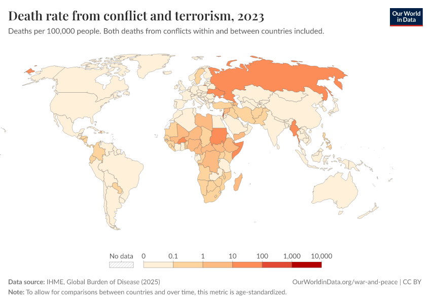 IHME, Global Burden of Disease (2025) – with major processing by Our World in Data. “Death rate from conflict and terrorism” [dataset]. IHME, Global Burden of Disease, “Global Burden of Disease - Deaths” [original data]. Retrieved February 26, 2026 from https://refactor-responseset-ergonom.owid.pages.dev:8789/20260211-174736/grapher/death-rates-from-conflict-and-terrorism-gbd.html (archived on February 11, 2026).