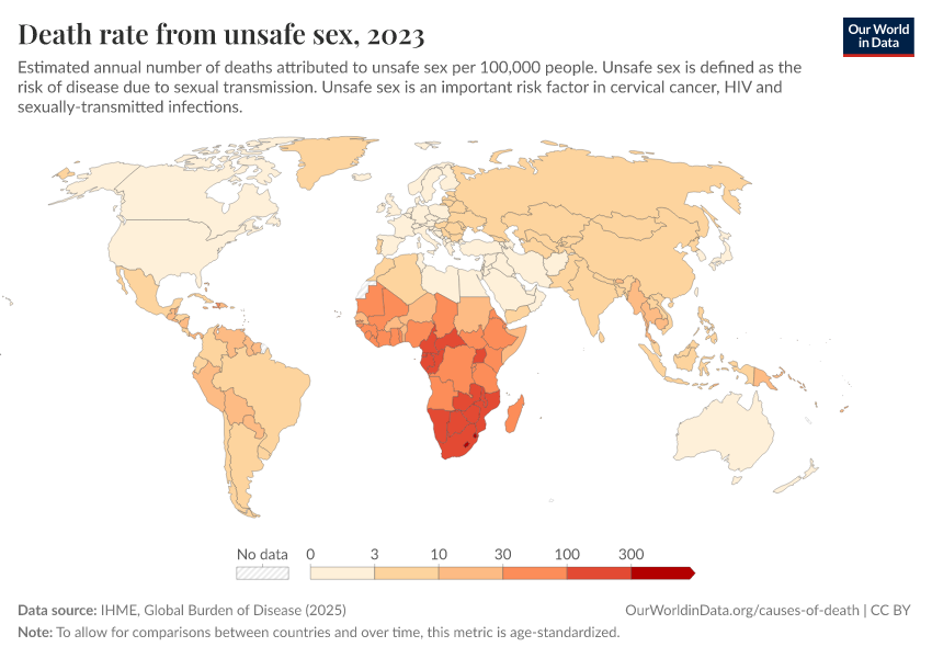 IHME, Global Burden of Disease (2025) – with major processing by Our World in Data. “Death rate from unsafe sex” [dataset]. IHME, Global Burden of Disease, “Global Burden of Disease - Risk Factors - Deaths” [original data]. Retrieved February 26, 2026 from https://refactor-responseset-ergonom.owid.pages.dev:8789/20260213-113303/grapher/death-rates-from-unsafe-sex.html (archived on February 13, 2026).