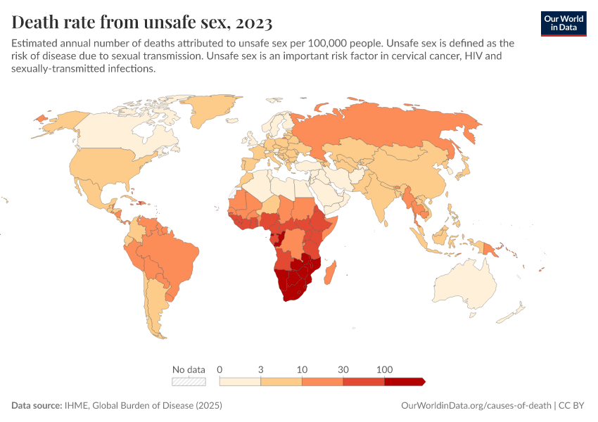 IHME, Global Burden of Disease (2025) – with major processing by Our World in Data. “Death rate from unsafe sex” [dataset]. IHME, Global Burden of Disease, “Global Burden of Disease - Risk Factors - Deaths” [original data]. Retrieved February 26, 2026 from https://refactor-responseset-ergonom.owid.pages.dev:8789/20260213-113303/grapher/death-rates-from-unsafe-sex-gbd.html (archived on February 13, 2026).