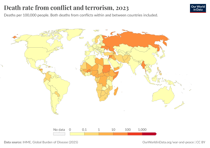 “Data Page: Death rate from conflict and terrorism”, part of the following publication: Esteban Ortiz-Ospina and Max Roser (2016) - “Global Health”. Data adapted from IHME, Global Burden of Disease. Retrieved from https://refactor-responseset-ergonom.owid.pages.dev:8789/20260211-173942/grapher/deaths-conflict-terrorism-per-100000.html [online resource] (archived on February 11, 2026).How to cite this data