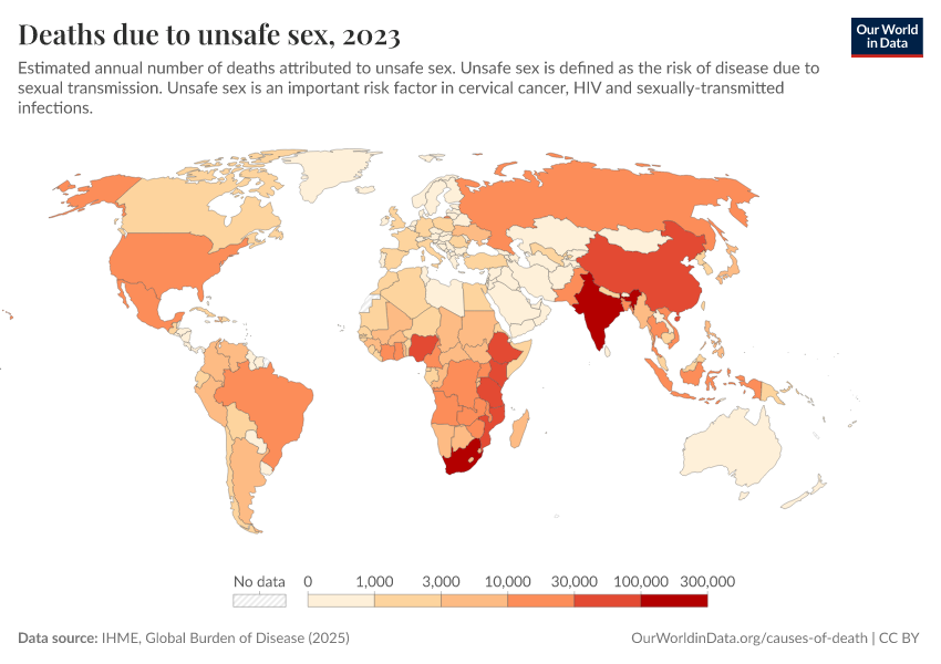 IHME, Global Burden of Disease (2025) – with major processing by Our World in Data. “Deaths due to unsafe sex” [dataset]. IHME, Global Burden of Disease, “Global Burden of Disease - Risk Factors - Deaths” [original data]. Retrieved February 26, 2026 from https://refactor-responseset-ergonom.owid.pages.dev:8789/20260213-112438/grapher/deaths-due-to-unsafe-sex.html (archived on February 13, 2026).