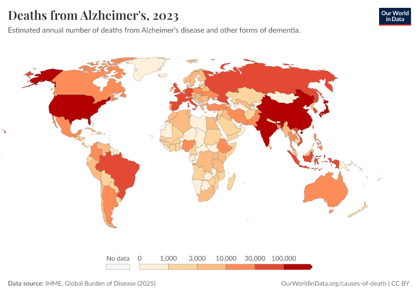 IHME, Global Burden of Disease (2025) – with major processing by Our World in Data. “Deaths from Alzheimer's” [dataset]. IHME, Global Burden of Disease, “Global Burden of Disease - Deaths” [original data]. Retrieved February 26, 2026 from https://refactor-responseset-ergonom.owid.pages.dev:8789/20260211-174736/grapher/deaths-from-alzheimers.html (archived on February 11, 2026).