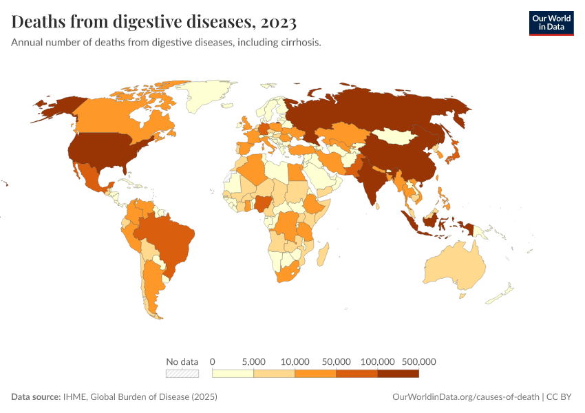 IHME, Global Burden of Disease (2025) – with major processing by Our World in Data. “Deaths from digestive diseases” [dataset]. IHME, Global Burden of Disease, “Global Burden of Disease - Deaths” [original data]. Retrieved February 26, 2026 from https://refactor-responseset-ergonom.owid.pages.dev:8789/20260211-174736/grapher/deaths-from-digestive-diseases.html (archived on February 11, 2026).