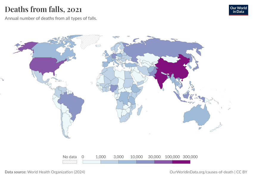 World Health Organization (2024) – with major processing by Our World in Data. “Deaths from falls” [dataset]. World Health Organization, “Global Health Estimates” [original data]. Retrieved February 26, 2026 from https://refactor-responseset-ergonom.owid.pages.dev:8789/20250909-093708/grapher/deaths-from-falls.html (archived on September 9, 2025).