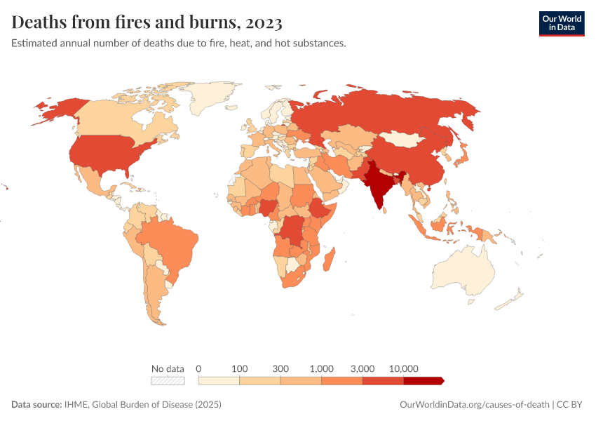 “Data Page: Deaths from fires and burns”, part of the following publication: Esteban Ortiz-Ospina and Max Roser (2016) - “Global Health”. Data adapted from IHME, Global Burden of Disease. Retrieved from https://refactor-responseset-ergonom.owid.pages.dev:8789/20260211-174736/grapher/deaths-from-fires-and-burns.html [online resource] (archived on February 11, 2026).How to cite this data