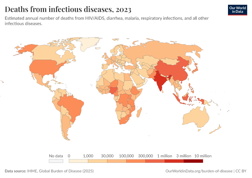 IHME, Global Burden of Disease (2025) – with major processing by Our World in Data. “Deaths from infectious diseases” [dataset]. IHME, Global Burden of Disease, “Global Burden of Disease - Deaths” [original data]. Retrieved February 26, 2026 from https://refactor-responseset-ergonom.owid.pages.dev:8789/20260211-174736/grapher/deaths-from-infectious-diseases.html (archived on February 11, 2026).