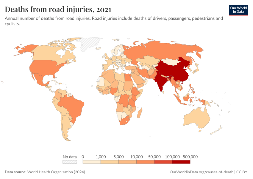 World Health Organization (2024) – with major processing by Our World in Data. “Deaths from road injuries” [dataset]. World Health Organization, “Global Health Estimates” [original data]. Retrieved February 26, 2026 from https://refactor-responseset-ergonom.owid.pages.dev:8789/20250909-093708/grapher/deaths-from-road-injuries.html (archived on September 9, 2025).