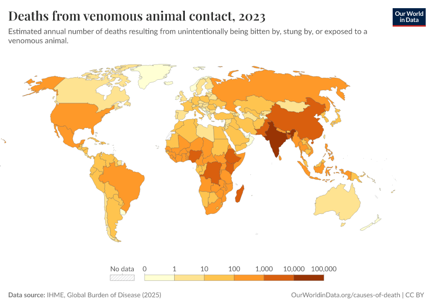 IHME, Global Burden of Disease (2025) – with major processing by Our World in Data. “Deaths from venomous animal contact” [dataset]. IHME, Global Burden of Disease, “Global Burden of Disease - Deaths” [original data]. Retrieved February 26, 2026 from https://refactor-responseset-ergonom.owid.pages.dev:8789/20260211-174736/grapher/deaths-from-venomous-animal-contact.html (archived on February 11, 2026).
