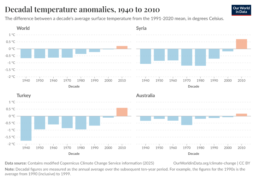 Contains modified Copernicus Climate Change Service information (2025) – with major processing by Our World in Data. “Decadal temperature anomalies” [dataset]. Contains modified Copernicus Climate Change Service information, “ERA5 monthly averaged data on single levels from 1940 to present 2” [original data]. Retrieved February 26, 2026 from https://refactor-responseset-ergonom.owid.pages.dev:8789/20260210-110915/grapher/decadal-temperature-anomaly.html (archived on February 10, 2026).