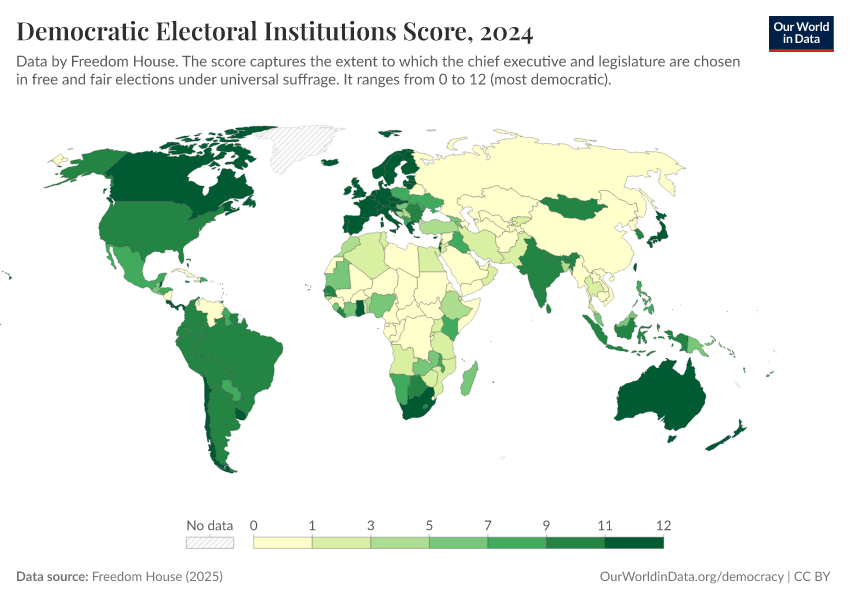 Freedom House (2025) – processed by Our World in Data. “Democratic Electoral Institutions Score” [dataset]. Freedom House, “Freedom in the World” [original data]. Retrieved February 26, 2026 from https://refactor-responseset-ergonom.owid.pages.dev:8789/20260204-170225/grapher/democratic-electoral-institutions-fh.html (archived on February 4, 2026).