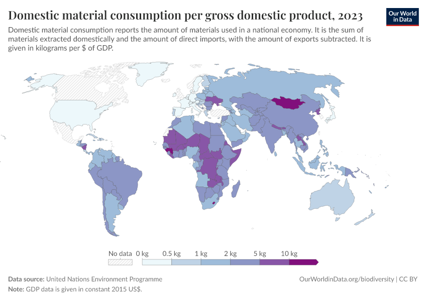 United Nations Environment Programme – processed by Our World in Data. “Domestic material consumption per gross domestic product” [dataset]. United Nations Environment Programme, “WESR / Global Material Flows Database” [original data]. Retrieved February 26, 2026 from https://refactor-responseset-ergonom.owid.pages.dev:8789/20260130-180113/grapher/domestic-material-consumption-per-unit-of-gdp.html (archived on January 30, 2026).