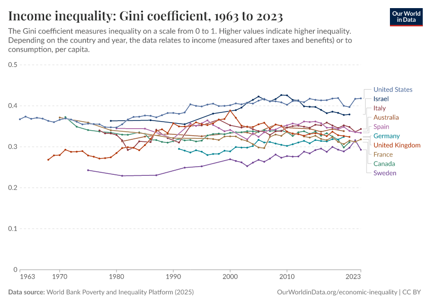 World Bank Poverty and Inequality Platform (2025) – with major processing by Our World in Data. “Income inequality: Gini coefficient – World Bank” [dataset]. World Bank Poverty and Inequality Platform, “World Bank Poverty and Inequality Platform (PIP) 20250930_2021, 20250930_2017” [original data]. Retrieved February 26, 2026 from https://refactor-responseset-ergonom.owid.pages.dev:8789/20260127-114142/grapher/economic-inequality-gini-index.html (archived on January 27, 2026).