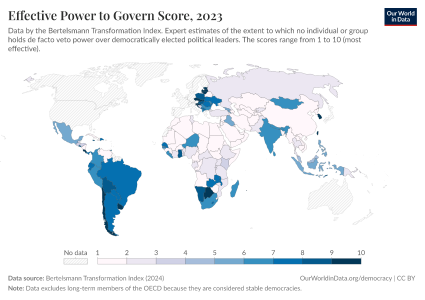 “Data Page: Effective Power to Govern Score”, part of the following publication: Bastian Herre, Lucas Rodés-Guirao, and Esteban Ortiz-Ospina (2013) - “Democracy”. Data adapted from Bertelsmann Transformation Index. Retrieved from https://refactor-responseset-ergonom.owid.pages.dev:8789/20260204-170225/grapher/effective-power-to-govern-score-bti.html [online resource] (archived on February 4, 2026).How to cite this data
